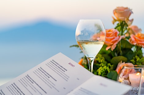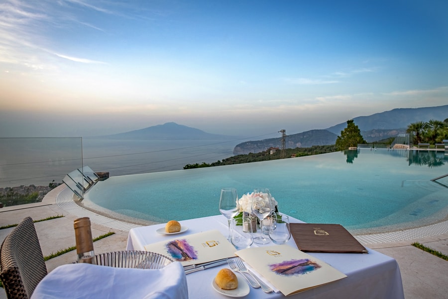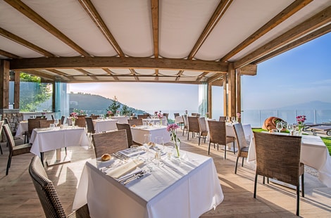 Eine bezaubernde Lage, am Pool, in der Brise der Hügel von Sorrent und mit dem Vesuv im Hintergrund, um fantastische Aussichten und Sonnenuntergänge zu genießen. Der perfekte Ort, um die Küche von Il Vespero, dem "a la carte" Restaurant des Grand Hotel Due Golfi, zu probieren. Es verfügt auch über einen grosszügigen Aussenbereich.