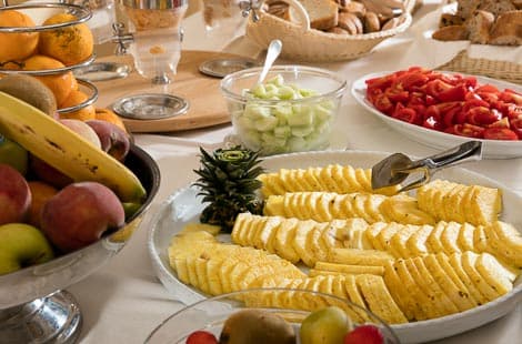 Ogni mattina la prima colazione viene servita nella sala vista mare con opzioni sia dolci che salate, spremute di frutta fresca e caffè preparato al momento.
